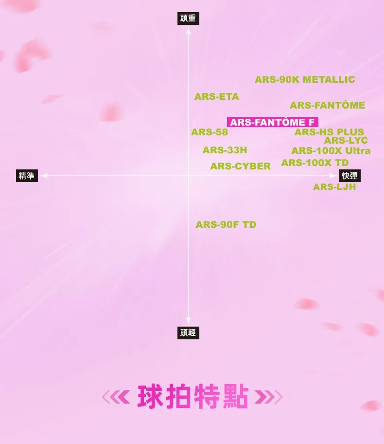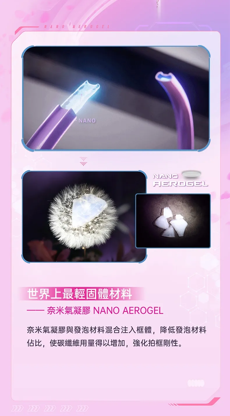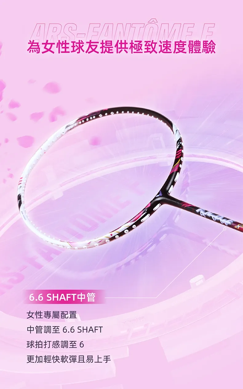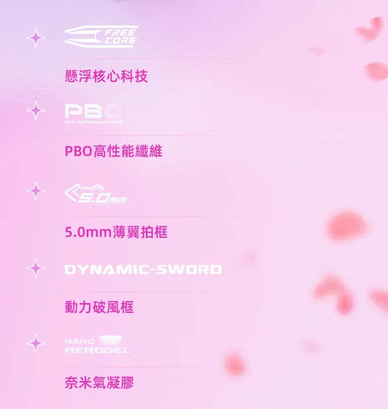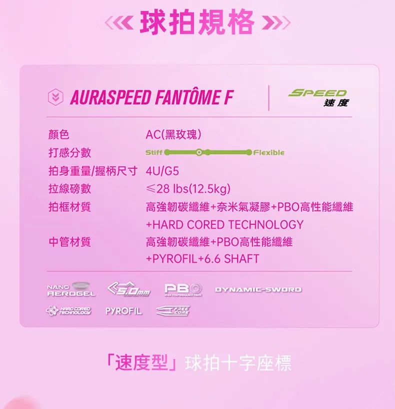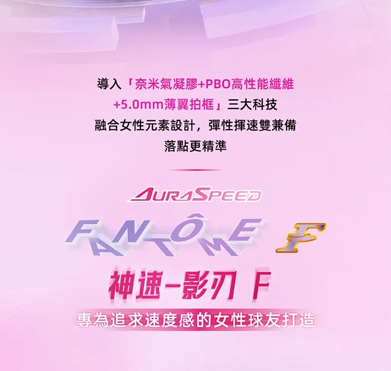 融合女性元素設計,導入奈米氣凝膠及PBO高性能纖維,彈性揮速雙兼備,落點更精準。