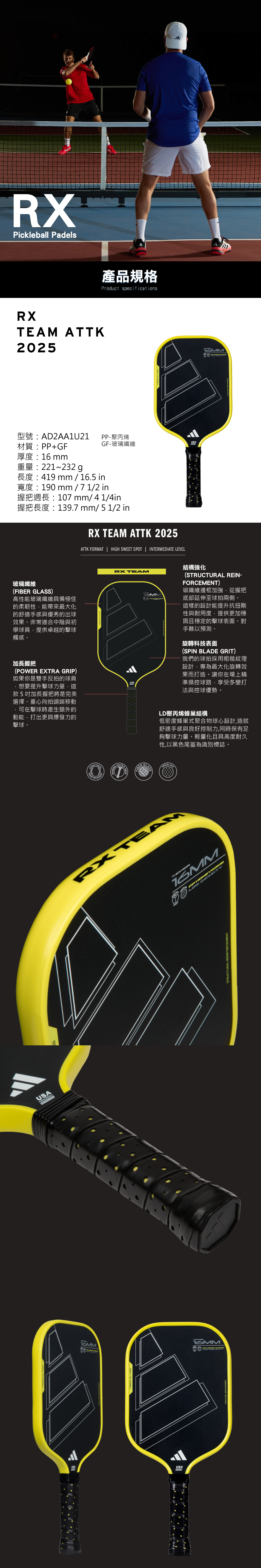 RX TEAM ATTK 是專為中階球員設計的理想匹克球拍,幫助你在提升防守能力的同時,依然保持精準與控球力。其加寬的拍面與居中的甜蜜點,能確保卓越的穩定性,讓你隨時打出精確且可控的球路。高強度握把提供穩固手感,提升每一次擊球的靈活度。