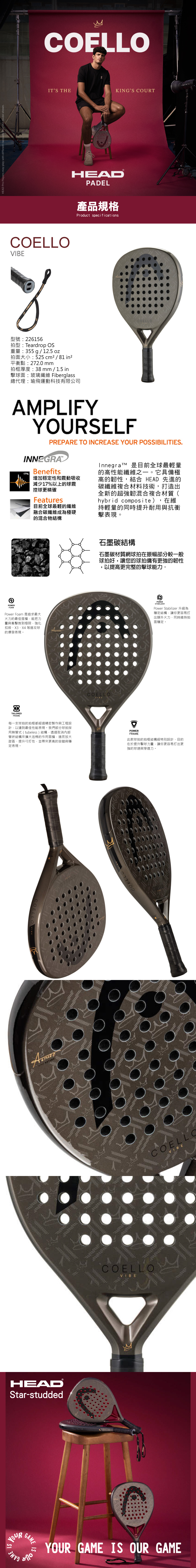 由「King Arturo」Arturo Coello 共同設計與開發的 COELLO VIBE 2026 PADEL RACQUET,專為新手與休閒玩家打造。世界第一的粉絲一定會愛上它——全新專屬且優雅的外觀,加入 Coello 的皇冠 Logo與簽名等個人細節。這支加大拍面(oversized)水滴拍型(teardrop)球拍,主打容易出力與更大的甜區,容錯更高、更好上手。相較其他 VIBE 款式它更偏重,能帶來額外火力;並採用玻璃纖維擊球面提供較柔和硬度,讓出力更輕鬆,同時搭配反應更快的 Power Foam 與 Integrated Protector System 防護技術。