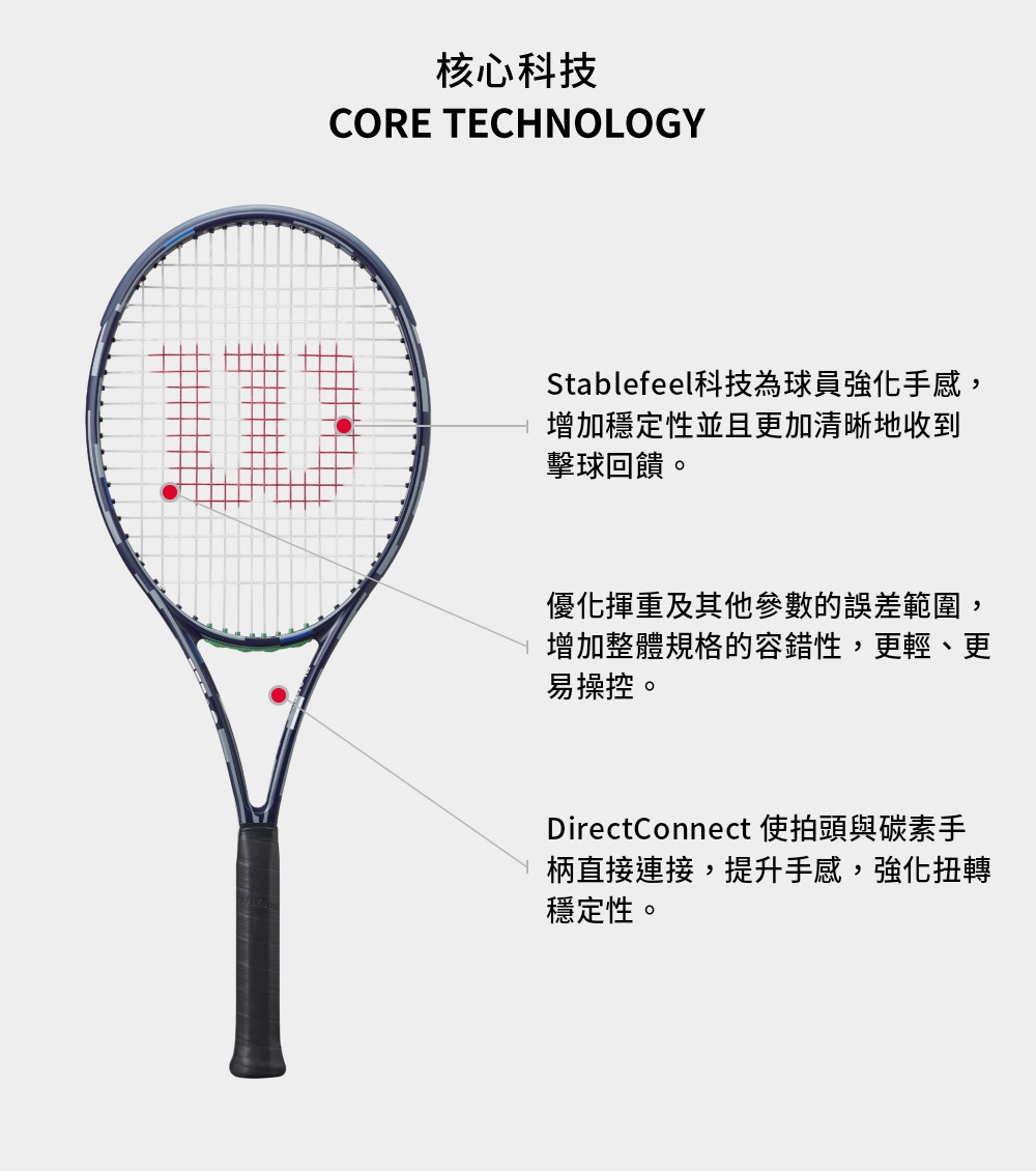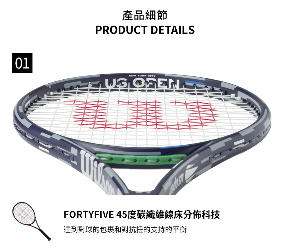 .FORTYFIVE° 碳纖維科技 為 FreeFlex 的進化版,以 45 度碳纖維結構分佈於整個拍框,平衡包球感與抗扭穩定性。